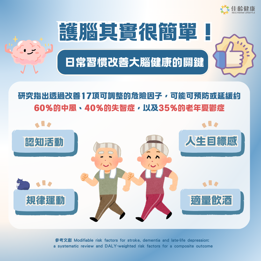 研究指出,透過改善這些可調整的危險因子,可能可預防或延緩約60%的中風、40%的失智症,以及35%的老年憂鬱症。雖然17項因子看起來很多,但彼此之間常常互有關聯,例如「和朋友一起去散步運動」,就可能同時改善血壓、血糖、體重、情緒、壓力、睡眠品質與社交互動。