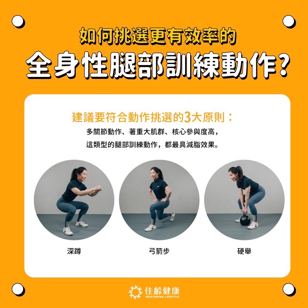 簡單的抬抬腿,對於減脂的效果不高,如果想要加強減脂效果,需要對於全身負荷更大、需要更多肌群同時發力,消耗能量更多,更有效率的全身性腿部訓練動作。建議動作挑選要符合三大原則:多關節動作、著重大肌群、核心參與度高,這類型的腿部訓練動作,都最具減脂效果。