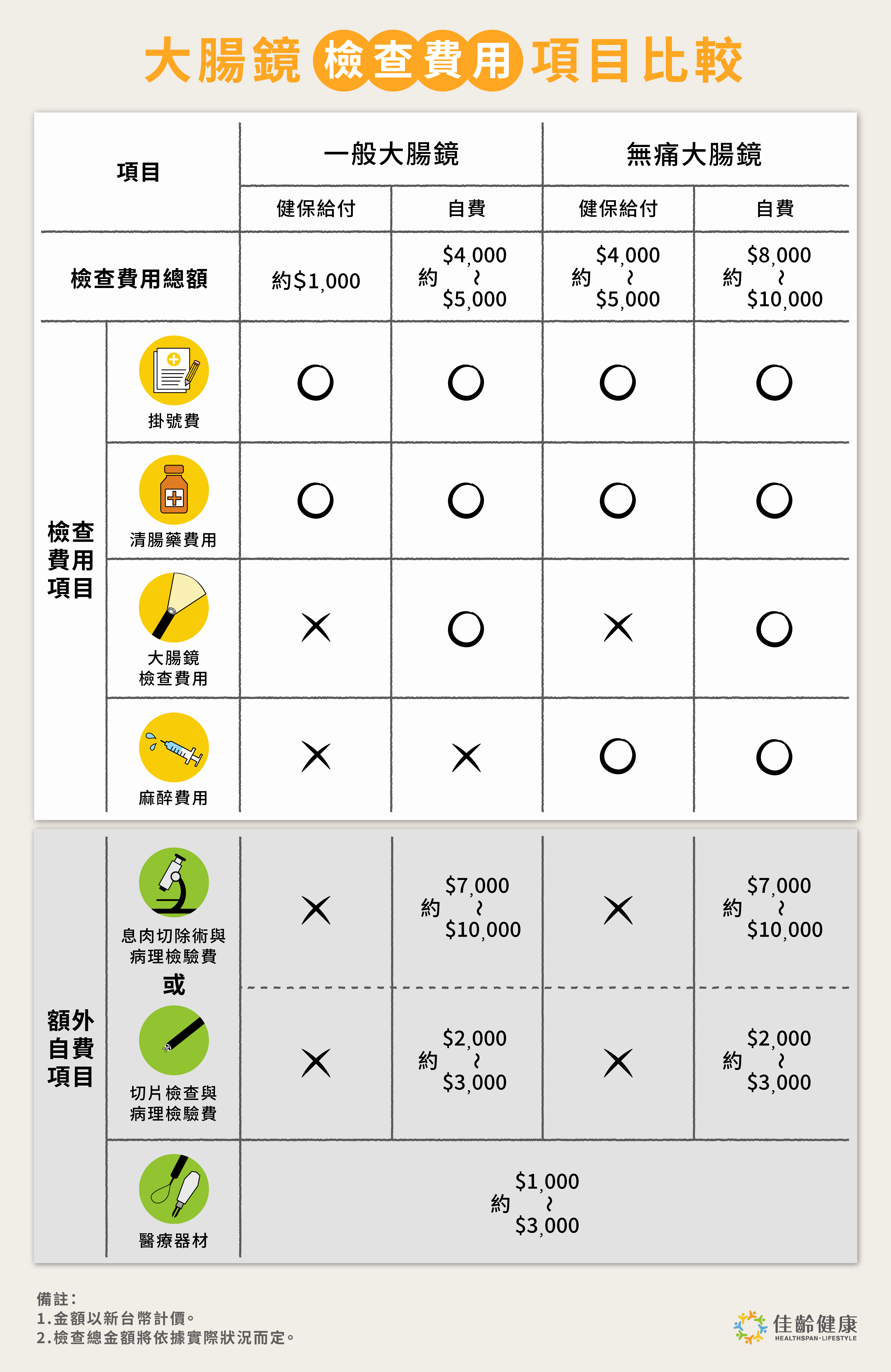 - 自費 大腸鏡 檢查 :約4,000-5,000元。