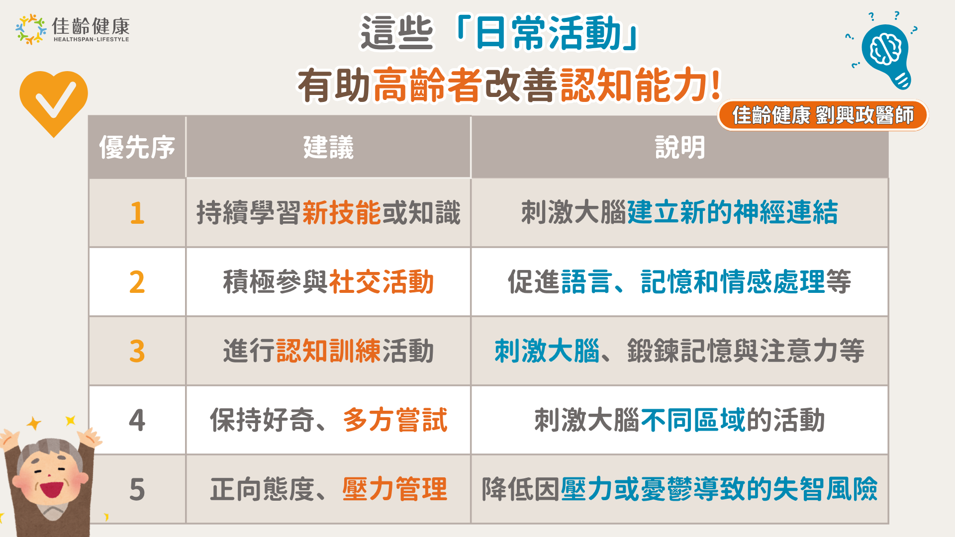 如玩益智遊戲(數獨、拼圖、橋牌)、閱讀、撰寫日記或學習使用新科技。這些活動能持續刺激大腦、鍛鍊記憶力、注意力、解決問題能力和邏輯思考。