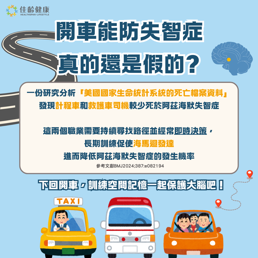 最近一份研究發現計程車和救護車司機較少死於阿茲海默失智症。這是使用美國國家生命統計系統的死亡檔案資料,涵蓋2020年1月1日至2022年12月31日的死亡紀錄,分析443種登記職業和是否因阿茲海默失智症死亡的關係。