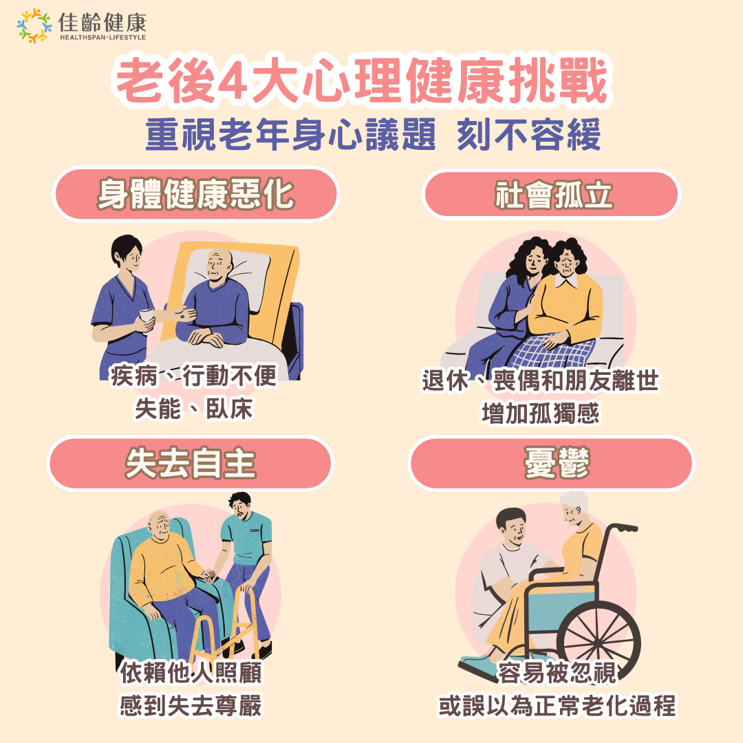 隨著年齡增長,老年人面臨許多心理健康挑戰,常見的包括: