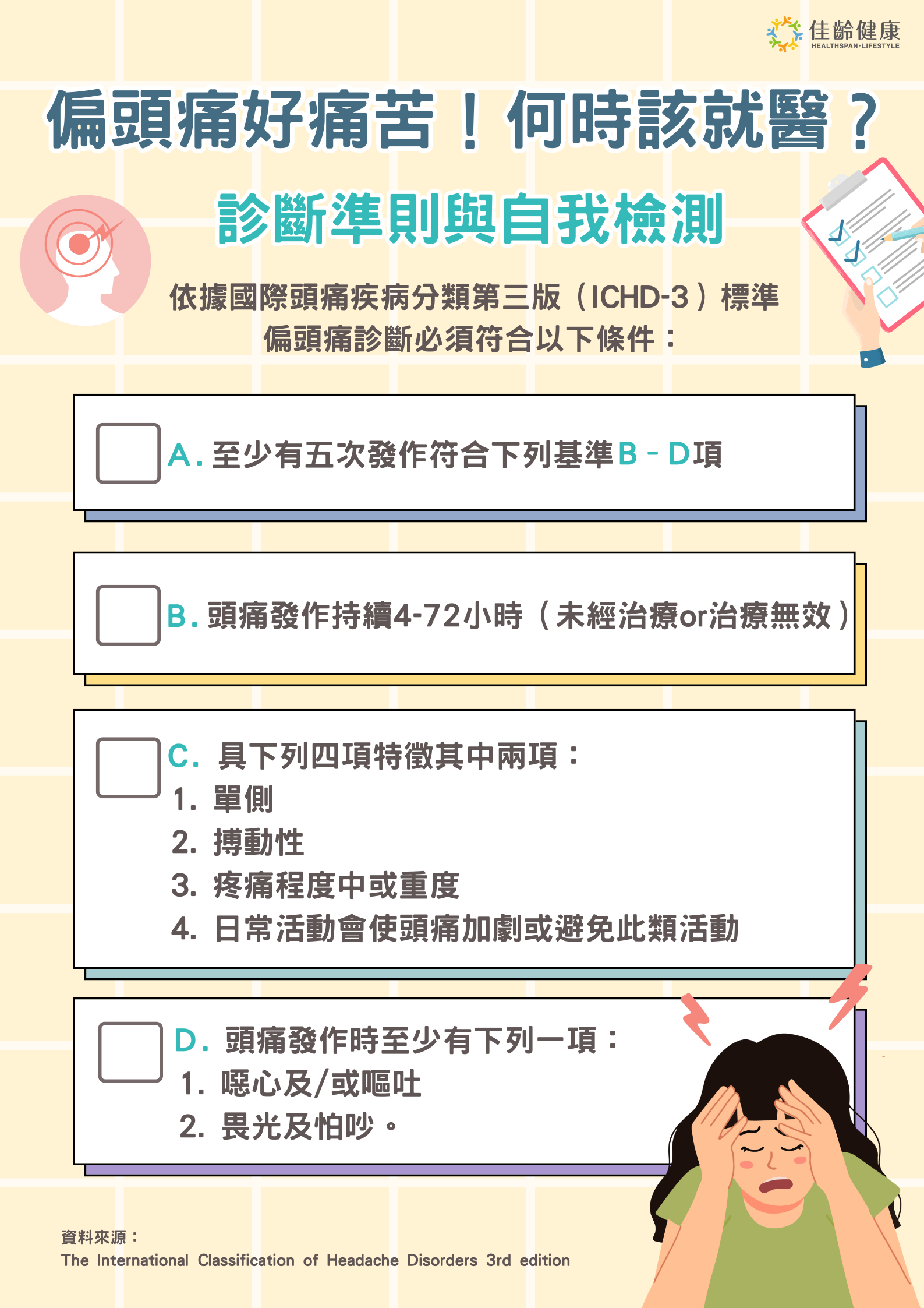 偏頭痛何時該就醫 ? 依據國際頭痛疾病分類第三版(ICHD-3)標準,偏頭痛診斷必須符合以下條件: