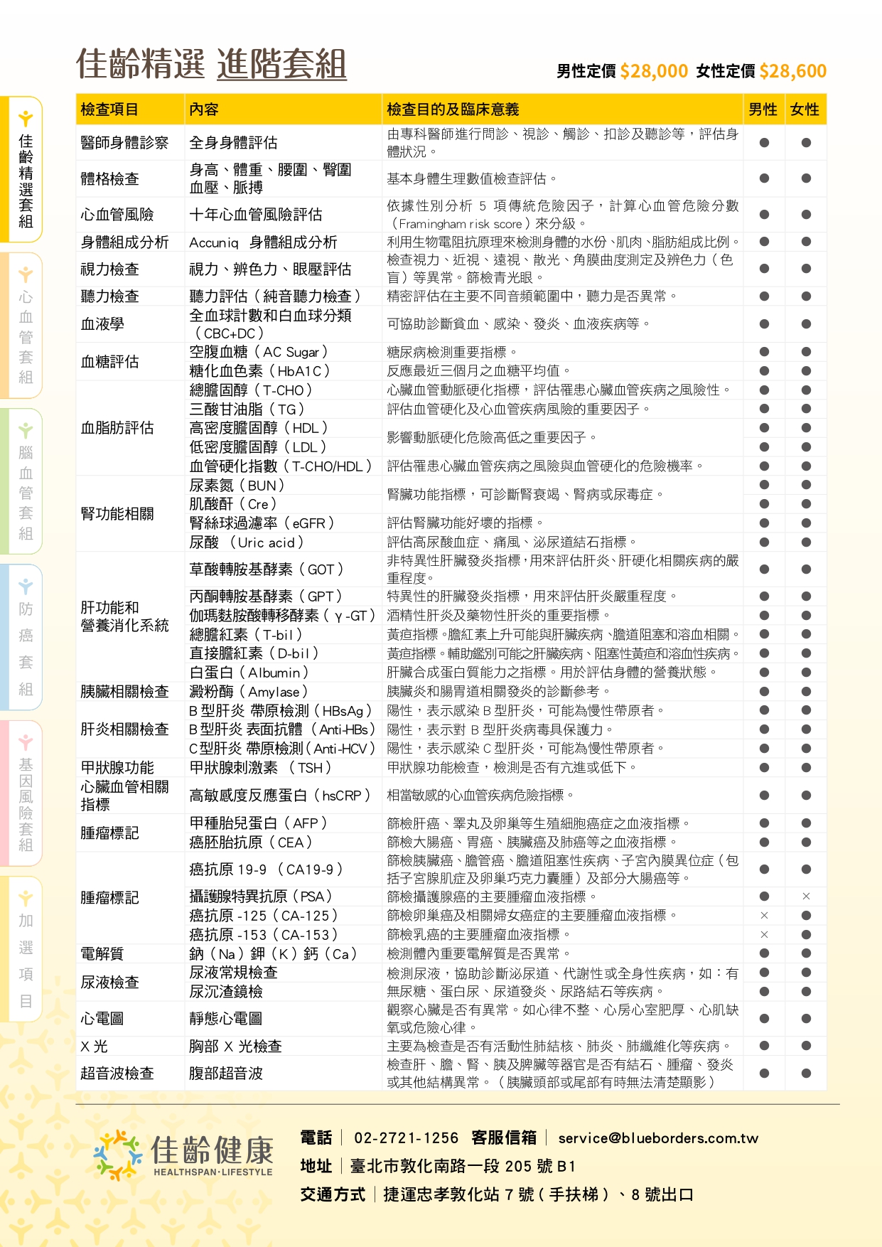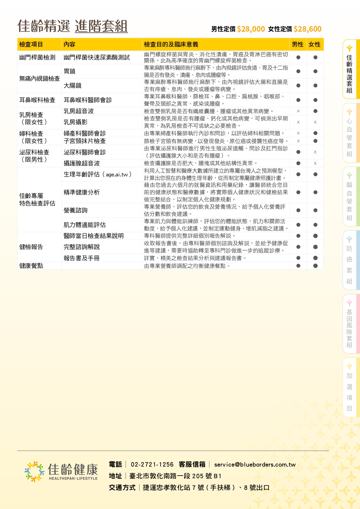 除了包含基本體檢的檢查項目,並加入更多的健康管理相關檢查,例如靜止期心電圖、肝功能、腎功能、血脂肪、腫瘤指標等血液生化檢查。