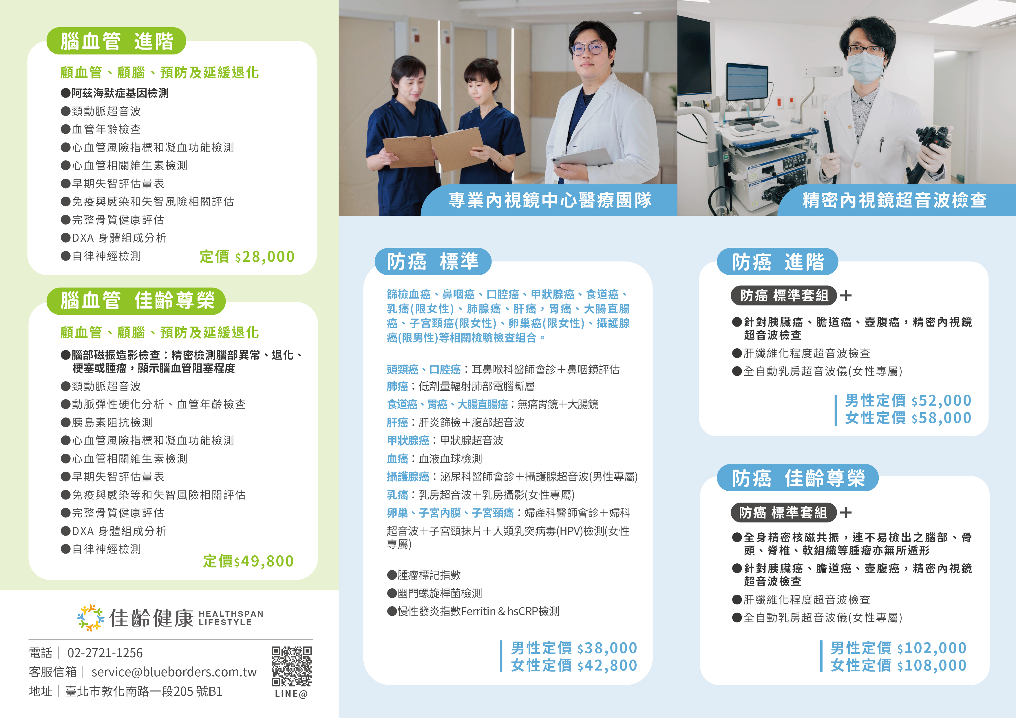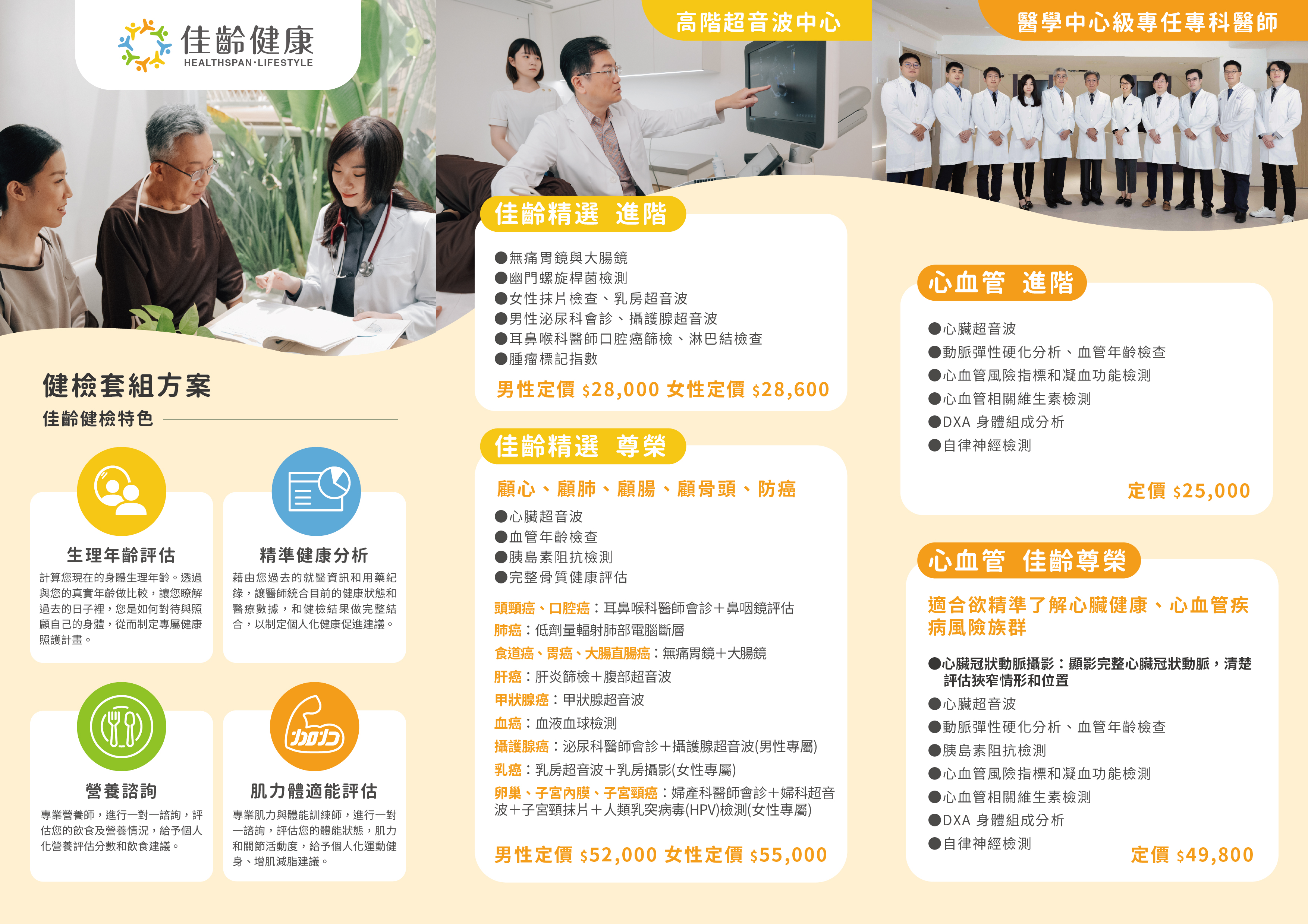 佳齡健康檢查方案,分為精選、心血管、腦血管、防癌套組: