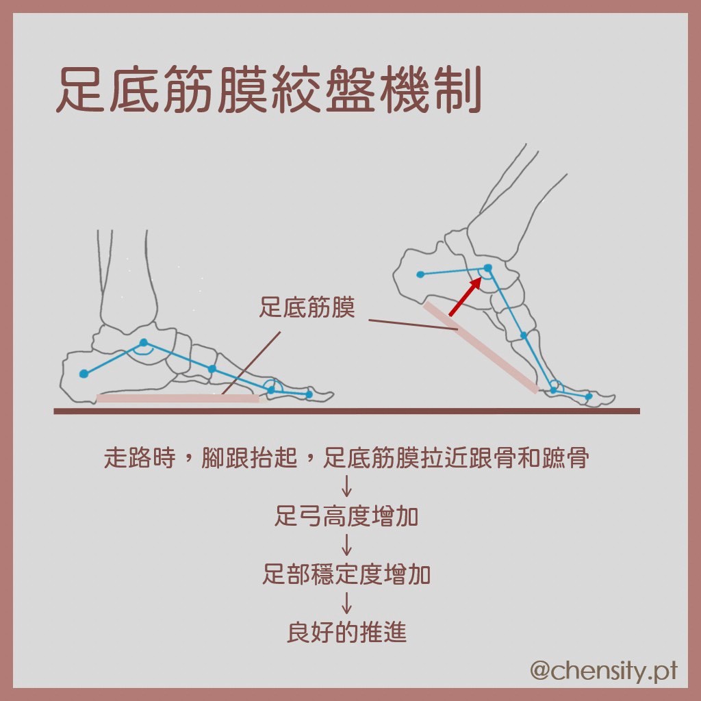 首先,先來認識「足底筋膜(Plantar Fascia)」的構造及其功用,足底筋膜從阿基里斯腱末端經過腳跟,一路延伸到腳底,變成一個扇形,是一個非常強壯且有彈性的結締組織,每當我們的腳底踩踏在地面時,足底筋膜可以幫我們吸收地面的衝擊力,如同一個「避震器」;同時足底筋膜也連著腳跟到附著在蹠骨的足底肌肉,當我們走路後腳跟提起推進離地時,繃緊的足底筋膜會拉近腳跟與蹠骨(絞盤機制,Windlass effect),如同一個拱門將足底撐起,增加內側足弓的彎曲度和足部穩定度,幫助我們走路時往前推進的力量。
