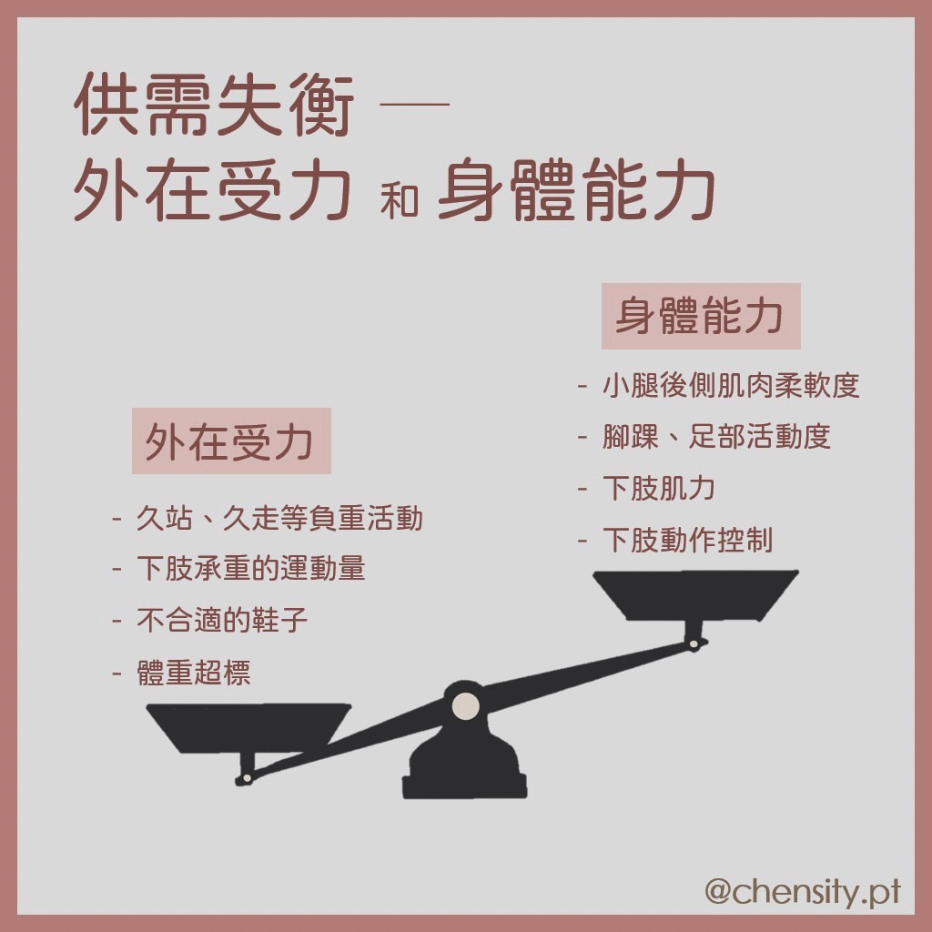 所以身體能力就好比「供給」,外在受力則好比「需求」,只要外在的受力大於下肢和足底筋膜的能力,就會供需失衡,造成足底筋膜炎或是長期的足底筋膜損傷,因癒合修復不佳導致病變。