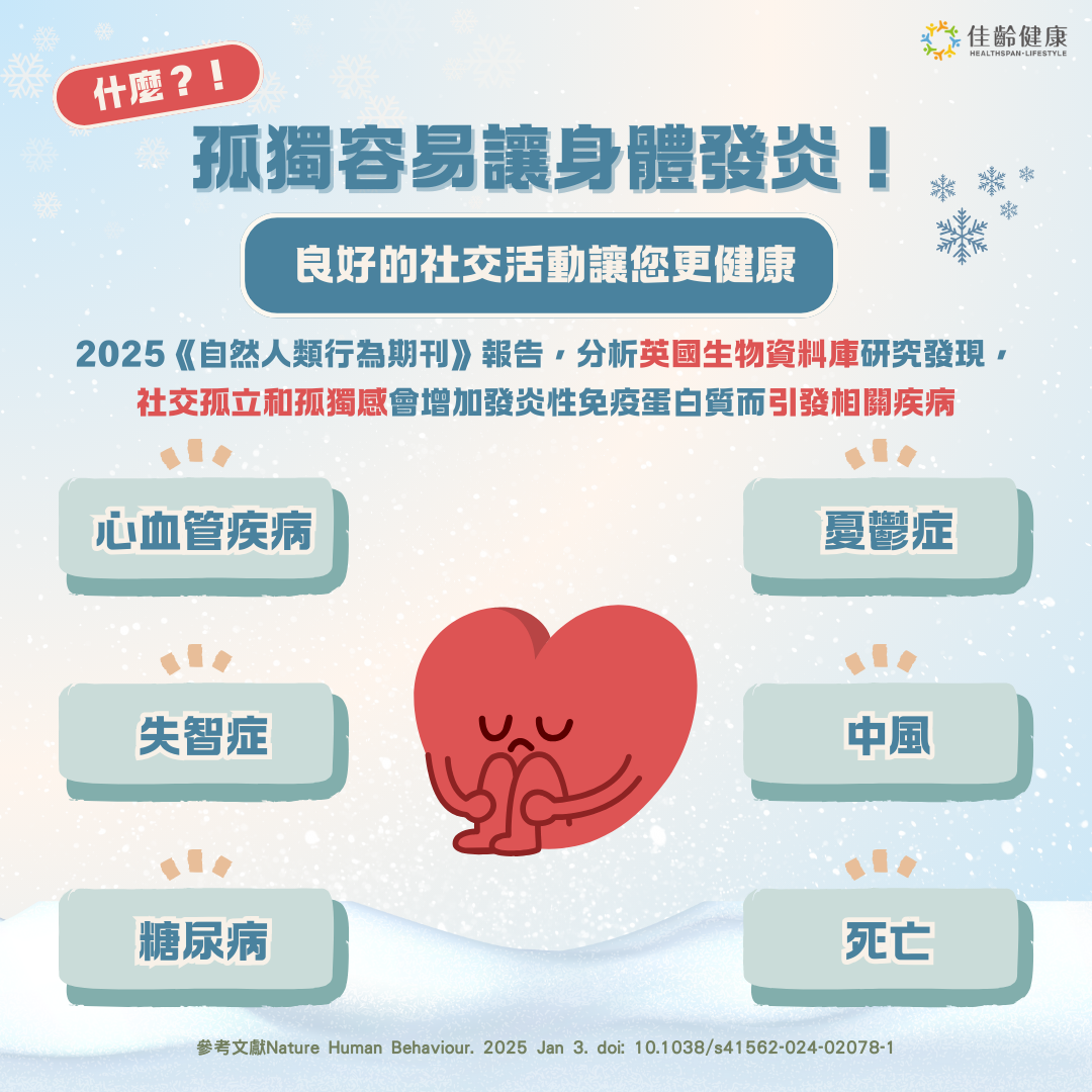 這個研究提供了生活型態與健康關係的生理關聯資料。在健康的生活型態裡,建構良好的社會連結是相當重要的一環。鼓勵每個人參與良性社交活動,比如和朋友參與宗教活動、學習成長課程和郊遊爬山等休閒娛樂,減少社交孤立和孤獨感,進一步降低體內發炎反應,讓您更健康。