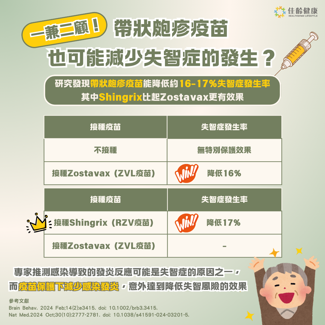 而發表在自然醫學(Nature Medicine)的研究更發現,新的基因重組帶狀皰疹疫苗Shingrix(RZV)似乎更有效果。美國在2017年10月以基因重組疫苗Shingrix(RZV)來取代活性病毒疫苗Zostavax(ZVL)。這個研究就是來比較2014/10-2017/9間接受ZVL的人,和在2017/11-2020/10間接受RZV的人之後發生失智症的比率,兩組皆有103,837人,失智症是採用電子病歷來做診斷。經過特別的統計演算後發現,接受RZV的人在接種6年內減少17%的失智症發生率;即使發生失智症,相較於ZVL,施打RZV的人也可以減緩約半年的失智症狀發生。且這個的保護效果在女性上更明顯。
