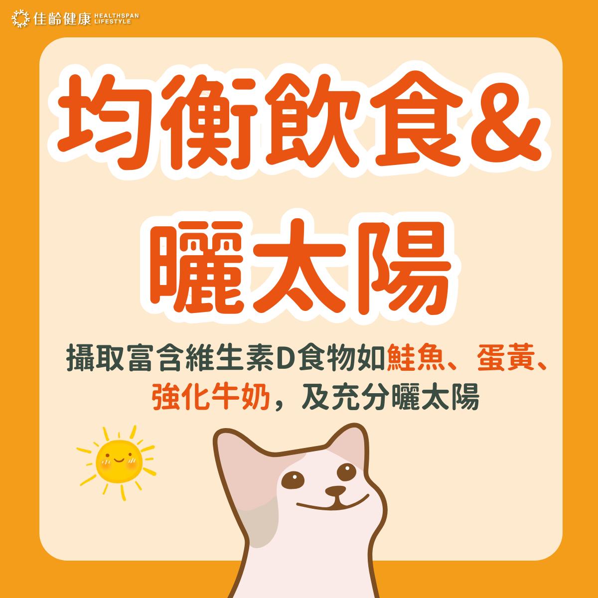 - 均衡飲食與陽光曝曬:攝取富含維生素D的食物(如鮭魚、蛋黃、強化牛奶),並適度曬太陽,有助促進體內合成維生素D。