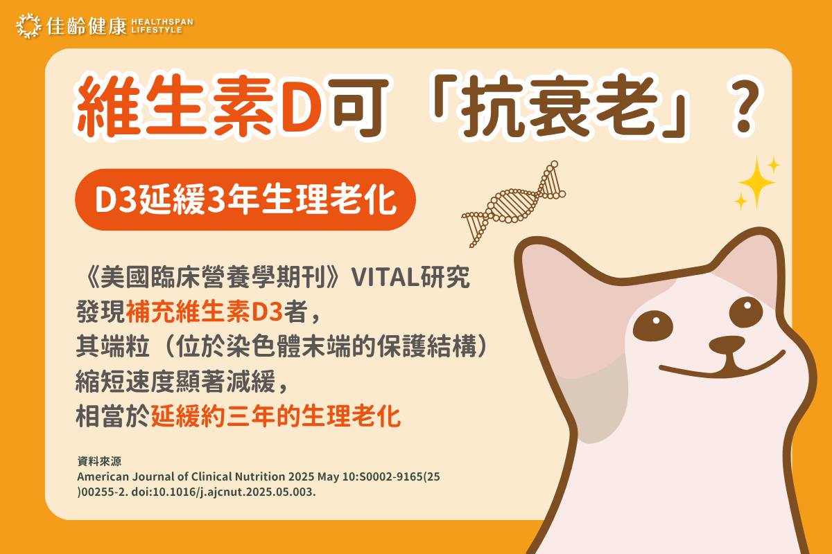 在追蹤的1054名受試者中,分析白血球端粒長度變化發現,補充維生素D3者,其端粒縮短速度顯著減緩,相當於延緩約三年的生理老化;而Omega-3則未顯示明顯效果。這項研究顯示,維生素D有潛力成為延緩老化的營養介入策略之一。