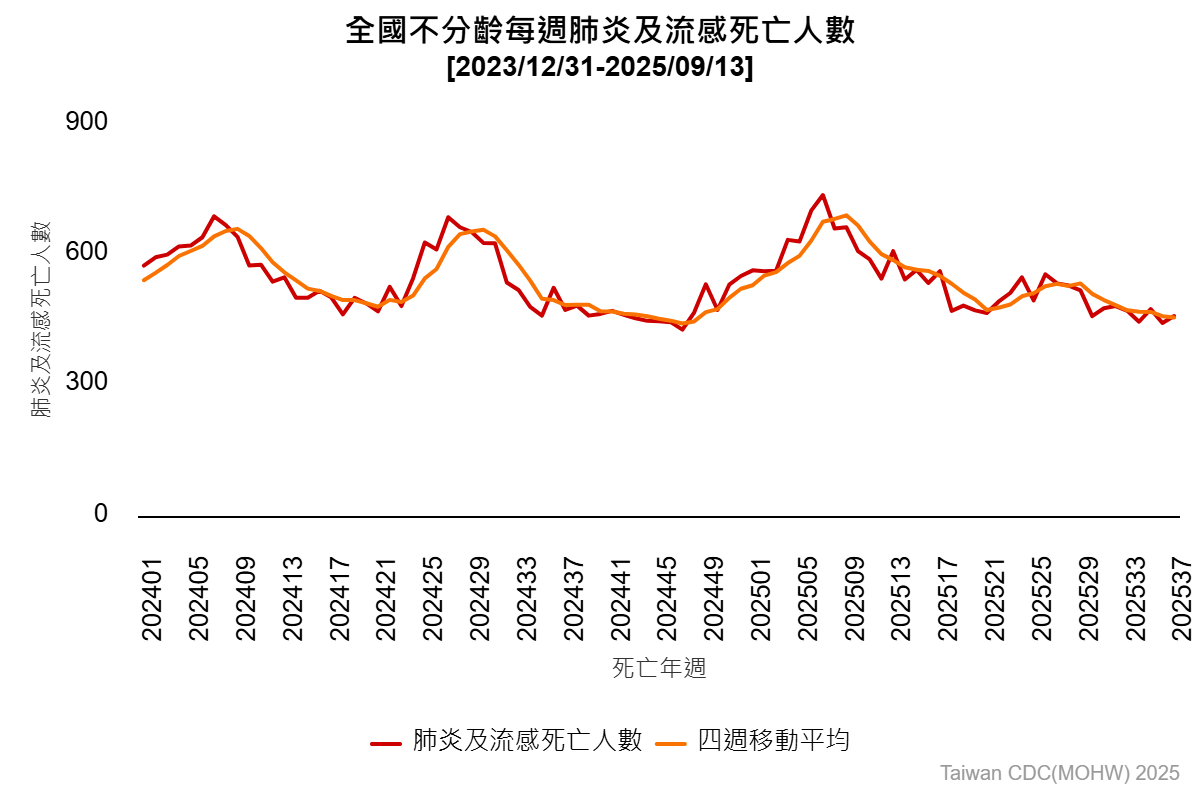 在第 20-38 週期間,肺炎及流感死亡人數的曲線與流感重症趨勢相呼應。死亡人數在第 24 週及第34 週前後都出現了波峰,這再次強調了流感可能引發的嚴重後果,特別是對於高風險族群而言。這些數據提醒我們必須對流感保持警惕。