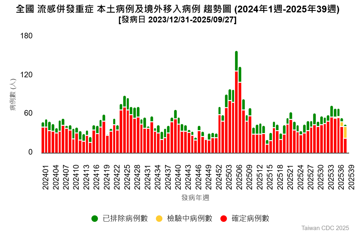 全國流感併發重症病例數於近幾週持續增加,特別是本土病例。第 34 週(8 月底~9 月初)的本土重症病例數明顯高於前幾週,這顯示社區中流感病毒的傳播力正在增強,且已造成一定程度的嚴重疾病負擔。值得注意的是,雖然流感疫情有起有伏,但重症病例數持續存在,顯示流感對健康仍構成實質威脅。