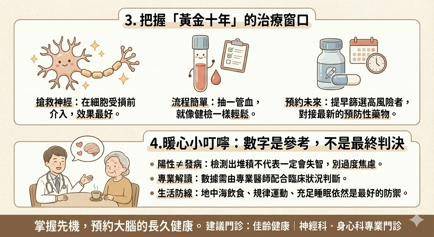 - 陽性不等於絕對發病:大腦有類澱粉蛋白堆積,並不代表最終一定會發展成失智症 。目前的科學仍無法 100% 預測發病的時間與機率 。