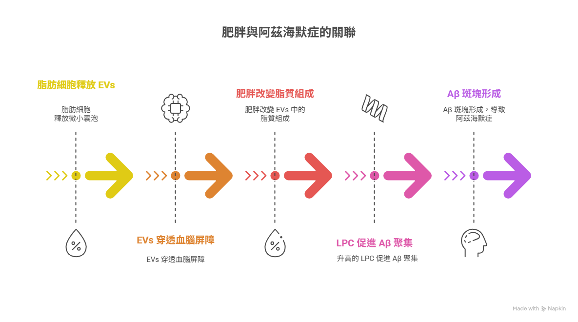 簡而言之,肥胖導致的脂肪代謝失調,透過這些載有特定異常脂質的 EVs,直接促進了阿茲海默症的 Aβ 聚集病理過程 。
