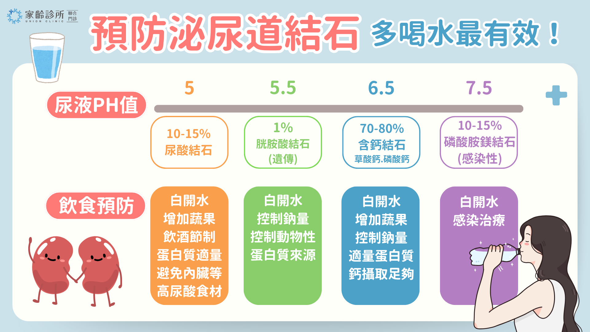 - 充分飲水能幫助小結石排除,經檢查太大顆的結石,仍需尋求醫師協助積極治療。