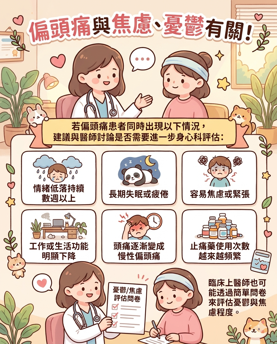 若偏頭痛患者同時出現以下情況,建議與醫師討論是否需要進一步身心科評估: