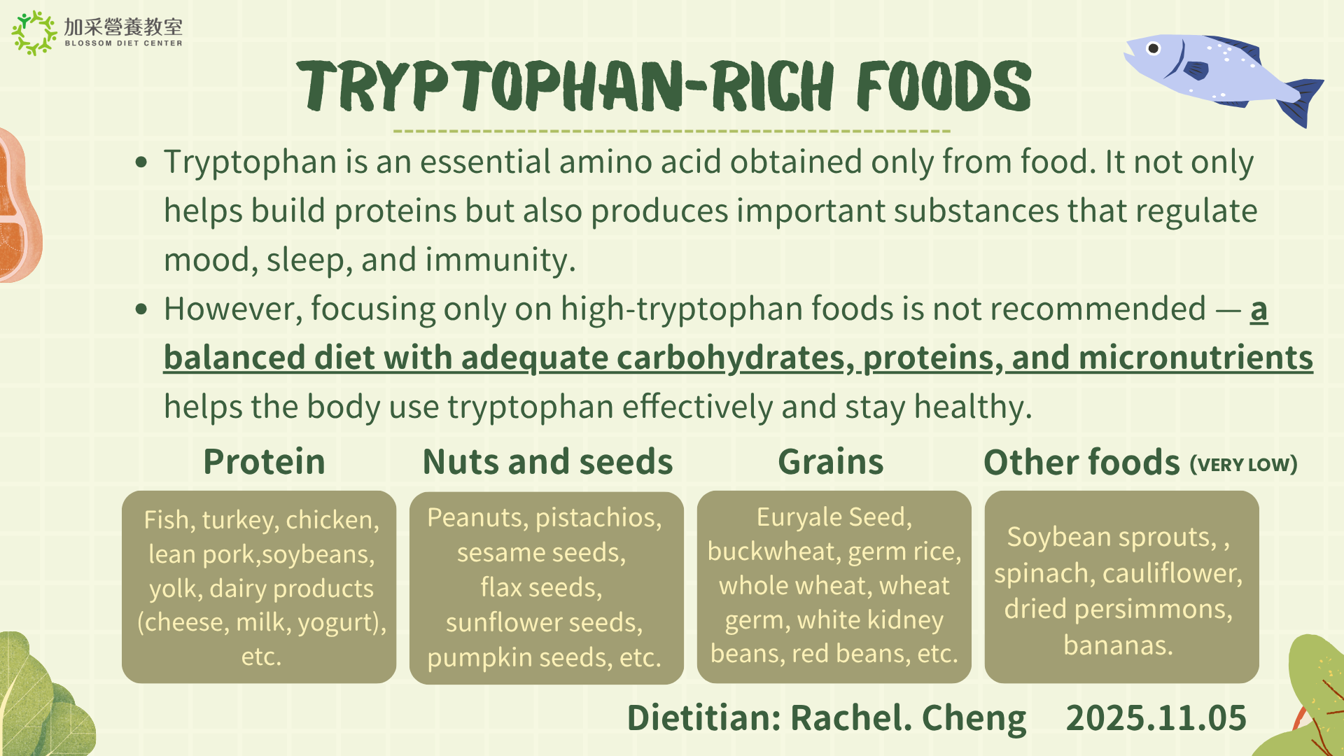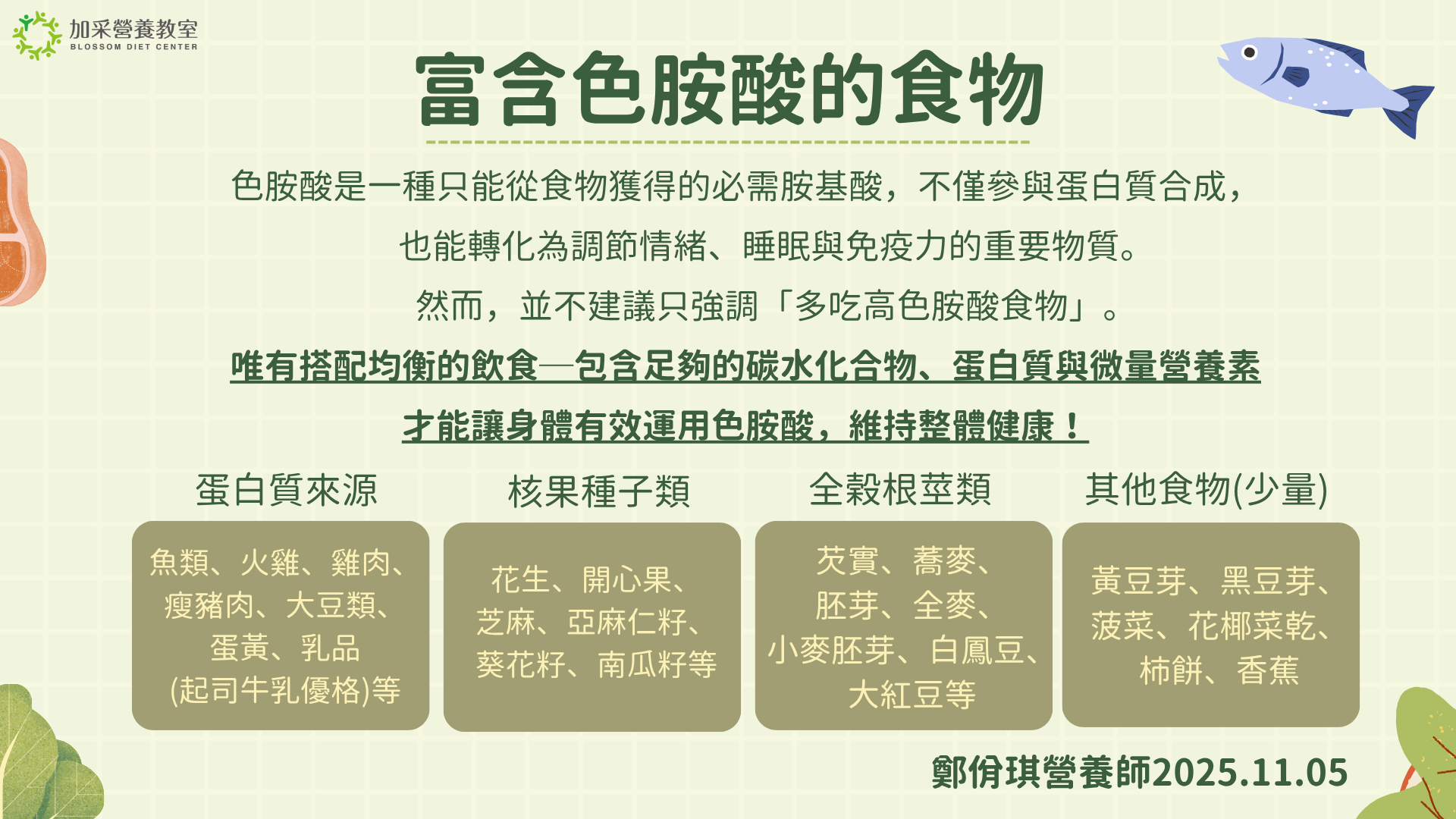 然而,並不建議只強調「多吃高色胺酸食物」。唯有搭配均衡的飲食─包含足夠的碳水化合物、蛋白質與微量營養素,才能讓身體有效運用色胺酸,維持整體健康!